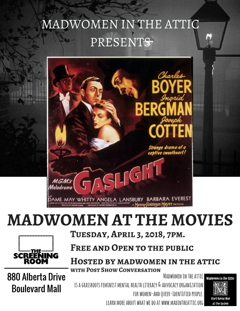 Madwomen in the Attic will be hosting a FREE screening of George Cukor’s 1944 film GASLIGHT, based on the 1938 play GAS LIGHT by Patrick Hamilton and starring Ingrid Bergman, Charles Boyer, and Angela Lansbury. The screening, held at The Screening Room on April 3rd at 7PM, is free and open to the public, and the space is accessible. We ask for small donations from those who can make them to help cover copyright and space/screening costs. Snacks and drinks will be available for purchase through The Screening Room. A brief community conversation will be held immediately following the film. A crisis services volunteer will be available for additional support.