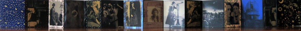 I’ve uncovered historical elements that were in the public domain (with no known copyright restrictions) which I’ve re-mixed and re-used, as colorized digital manipulations onto decorative papers, as archival pigments prints. I’ve hand-cut each fragment into collaged puzzle-pieces – and have fashioned an accordion-fold picture book. There was no real rhyme or reason to the composition of the pages – much like the hap-hazard arrangement of the constellations in the enigmatic night sky. Leslie Stephen, Virginia Woolf’s father, was a distinguished man of letters who engaged in the Victorian passion of natural history, including astronomy. Young Virginia, who didn’t receive a formal tutelage, spent much of her early formative years, among his vast archive of knowledge. She would later write, “I owe all the education I ever had to my father’s library.” Virginia Woolf owed a greater self-confidence of her many personal assets to her friend and colleague Vita. The two women bonded over their restrained childhoods and emotionally inattentive parents. Vita convinced Virginia that her ailments had been misdiagnosed and that she should focus on her own diverse pursuits. Stargazing became a crucial aspect of their world.