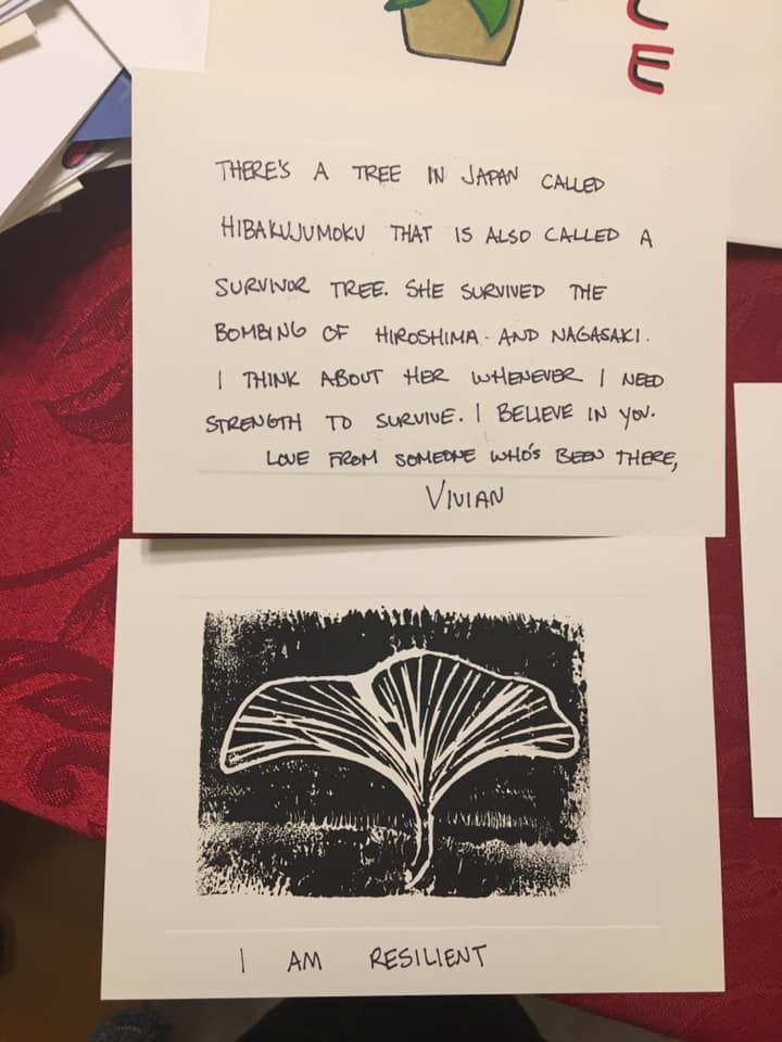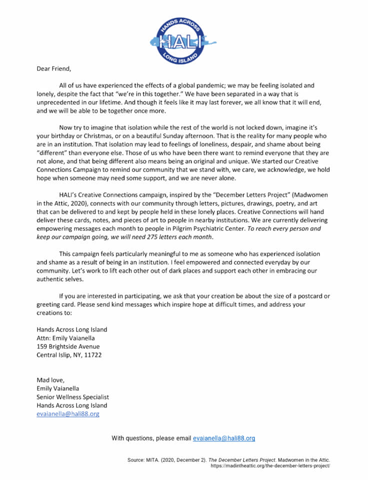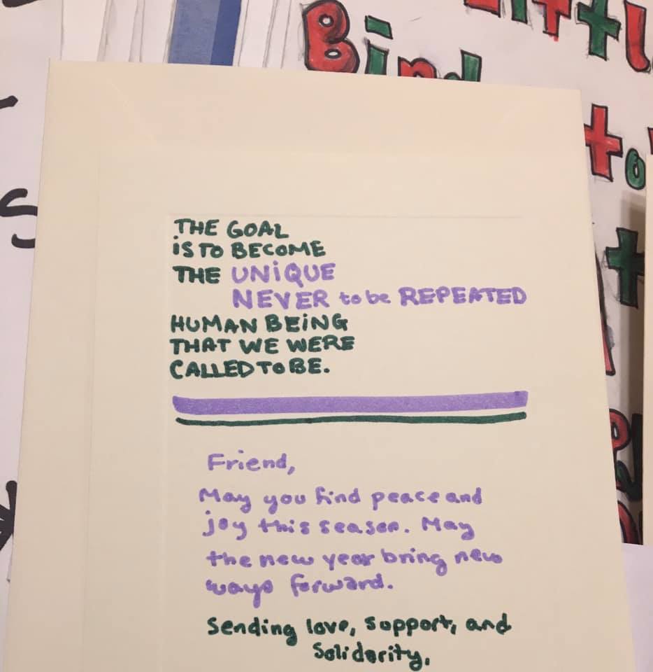 The December Letters Project is an annual feminist mental health literacy project aimed at alleviating the isolation, loneliness, and stigma that often accompany inpatient stays at mental health institutions. By flooding our local MH institutions with support and love for our friends within those institutions during the winter solstice, through cards and letters, our goal is to build a bridge between institution and community. Groups and organizations anywhere can participate in the December Letters Project by reaching out to local MH institutions to build a bridge and to gather and deliver cards during the winter solstice. Locally, we come together with other community organizations, classes, groups, and schools to deliver cards annually to our friends at two local institutions: the Buffalo Psychiatric Center and WNY Children’s Psychiatric Center.