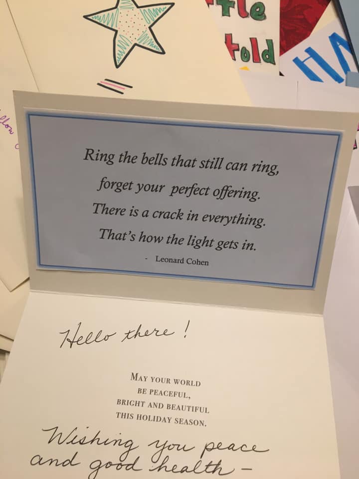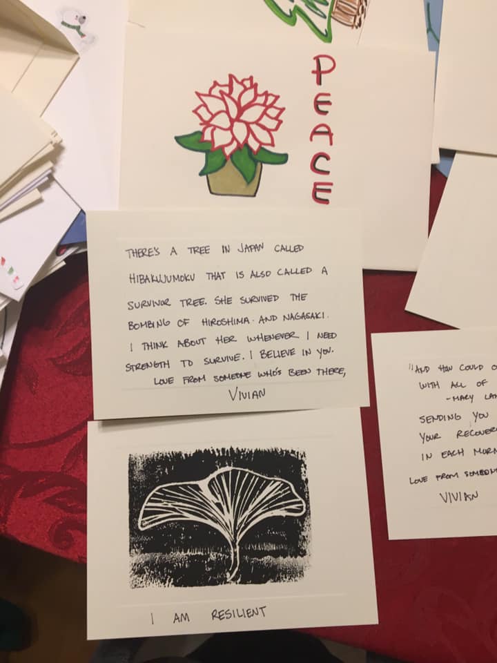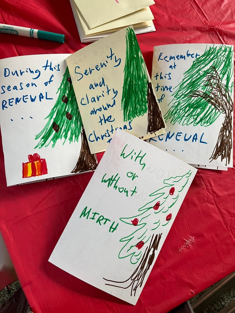 If you are a teacher at a school or if you are part of an organization whose members care about social justice and about the treatment of people within mental healthcare systems, please consider being part of our project this year, either by writing cards with your group and dropping them off to your local mental health institution(s), by delivering your cards to us for our institutions, or by coming to our November meeting to make cards with us, if you are local to the western New York area! If you want to help but cannot make cards, you can also donate card-making materials– we just ask that they be secular in their design. This is a great project to do with middle school, high school, and college students.