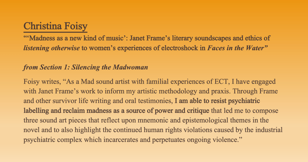 - Foisy writes, “As a Mad sound artist with familial experiences of ECT, I have engaged with Janet Frame’s work to inform my artistic methodology and praxis. Through Frame and other survivor life writing and oral testimonies, I am able to resist psychiatric labelling and reclaim madness as a source of power and critique that led me to compose three sound art pieces that reflect upon mnemonic and epistemological themes in the novel and to also highlight the continued human rights violations caused by the industrial psychiatric complex which incarcerates and perpetuates ongoing violence.”