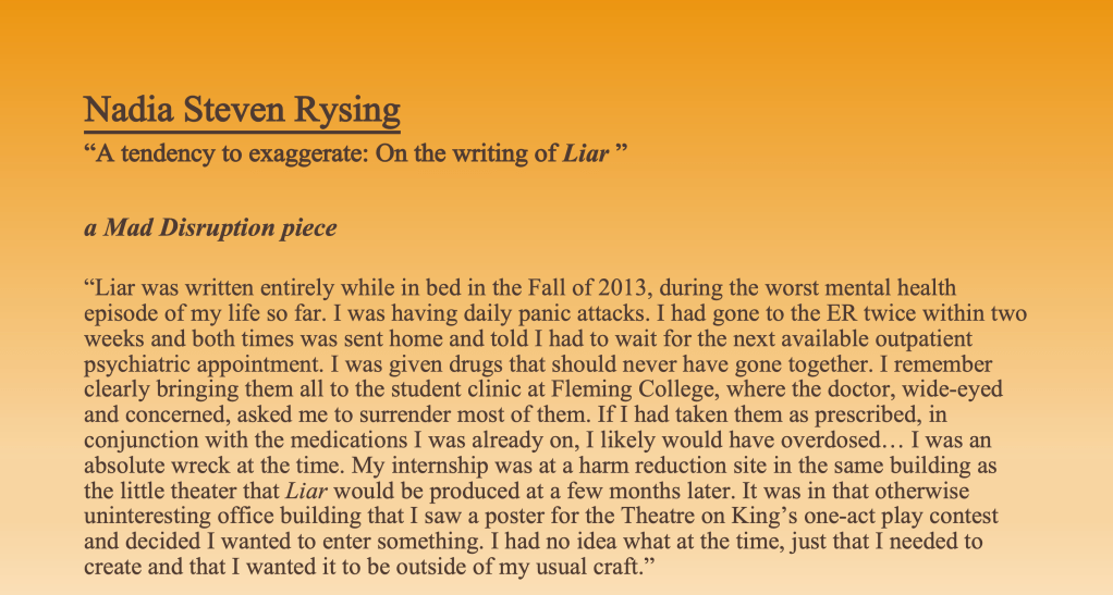 - “Liar was written entirely while in bed in the Fall of 2013, during the worst mental health episode of my life so far. I was having daily panic attacks. I had gone to the ER twice within two weeks and both times was sent home and told I had to wait for the next available outpatient psychiatric appointment. I was given drugs that should never have gone together. I remember clearly bringing them all to the student clinic at Fleming College, where the doctor, wide-eyed and concerned, asked me to surrender most of them. If I had taken them as prescribed, in conjunction with the medications I was already on, I likely would have overdosed… I was an absolute wreck at the time. My internship was at a harm reduction site in the same building as the little theater that Liar would be produced at a few months later. It was in that otherwise uninteresting office building that I saw a poster for the Theatre on King’s one-act play contest and decided I wanted to enter something. I had no idea what at the time, just that I needed to create and that I wanted it to be outside of my usual craft.”