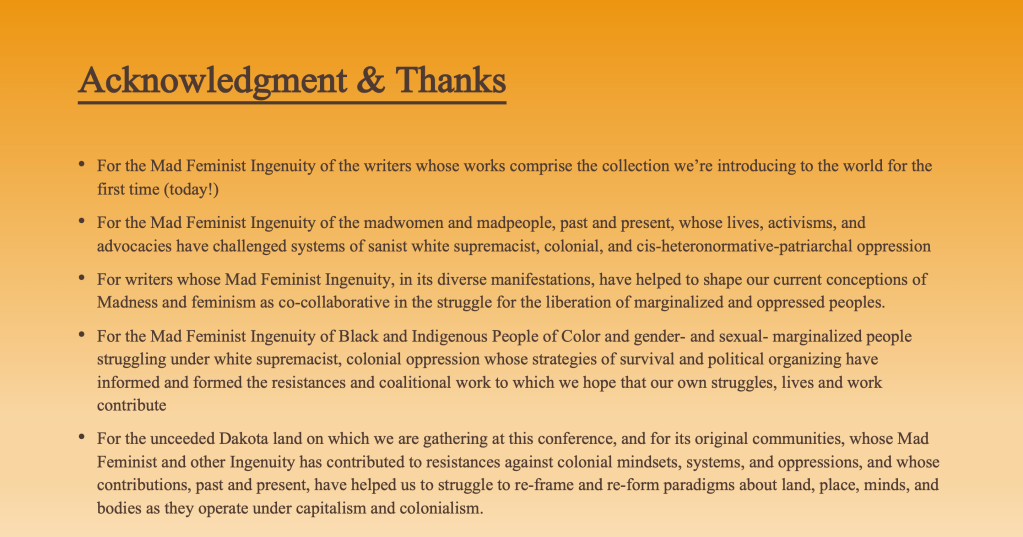 •For the unceeded Dakota land on which we are gathering at this conference, and for its original communities, whose Mad Feminist and other Ingenuity has contributed to resistances against colonial mindsets, systems, and oppressions, and whose contributions, past and present, have helped us to struggle to re-frame and re-form paradigms about land, place, minds, and bodies as they operate under capitalism and colonialism.