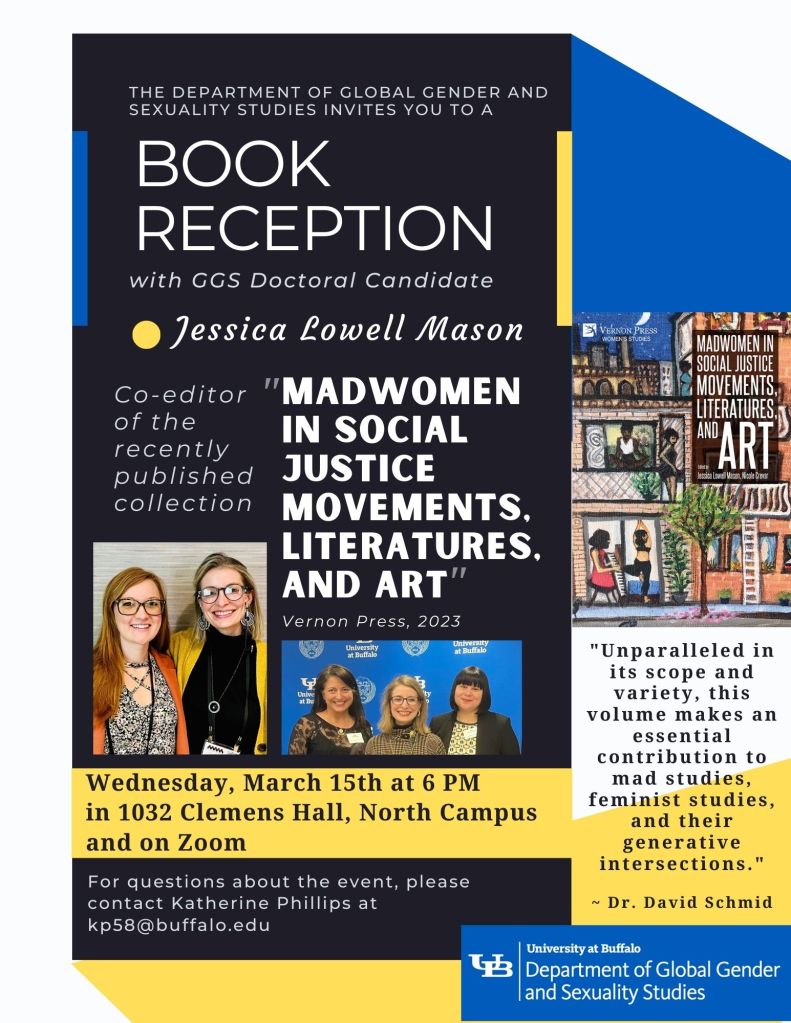 This month, the Department of Global Gender and Sexuality Studies at the University at Buffalo hosted a book reception for “Madwomen in Social Justice Movements, Literatures, and Art” (Vernon Press), co-edited by Jessica Lowell Mason (MITA’s co-founder) and Nicole Crevar. The reception was held held at UB in Clemens Hall, North Campus, on March 15, 2023.