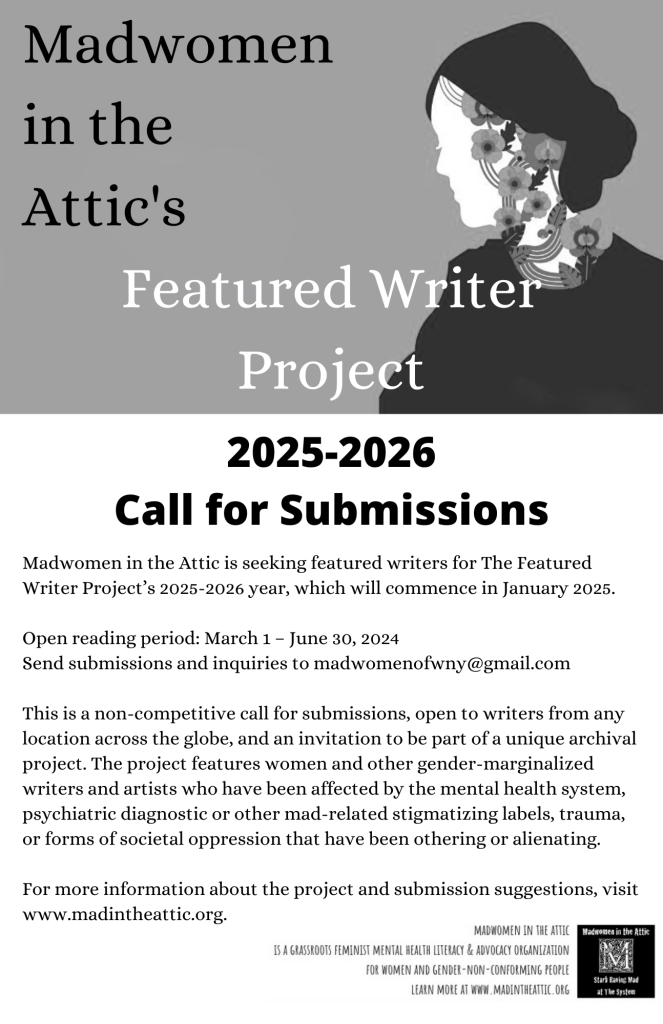 Madwomen in the Attic is seeking featured writers for The Featured Writer Project’s 2025-2026 writing year, which will begin in January 2025.