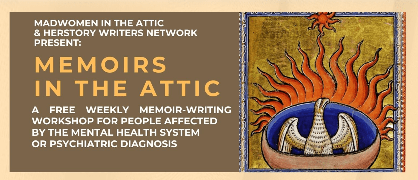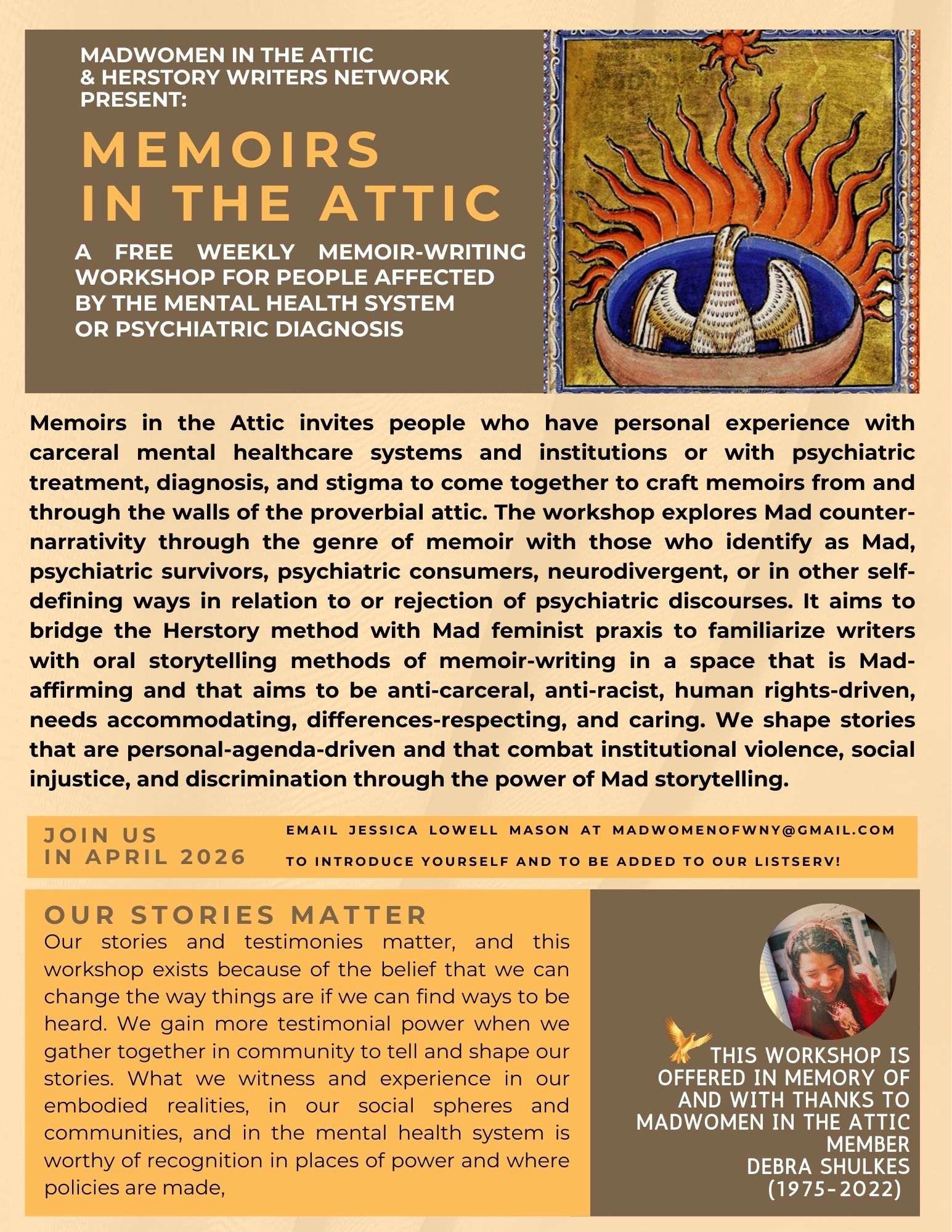 A partnership between Madwomen in the Attic and Herstory Writers Network, Memoirs in the Attic is an ongoing, free-to-the-public weekly online memoir workshop offered in memory of and with thanks to Madwomen in the Attic member Debra Shulkes (1975-2022). The workshop invites people who have had personal experience with carceral mental healthcare systems and institutions or with psychiatric treatment and diagnoses to come together to craft memoirs from and through the walls of the proverbial attic. The workshop explores Mad counter-narrativity in and through the genre of memoir with those who identify as Mad, psychiatric survivors, psychiatric consumers, neurodivergent, or in other self-defining ways in relation to or rejection of psychiatric discourses and apparatuses. In the 2015 collection Madness, Distress, and the Politics of Disablement, the late human rights and psych survivor advocate Debra Shulkes put forth an intention of “imagining communities that value and fully respect the rights of people who experience madness and distress.” This workshop aims to do just that by bridging the Herstory method with Mad feminist praxis in order to familiarize writers with Herstory storytelling methods of memoir-writing in a space that is Mad-affirming and that aims to be anti-carceral, anti-racist, human rights-driven, needs accommodating, differences-respecting, and caring. In Memoirs in the Attic, we shape stories that are personal-agenda-driven and that combat institutional violence, social injustice, and discrimination through the power of Mad storytelling to change hearts, minds, and policies where consciousness, behavior, and our psychic, social, and bodily realities are concerned. We invite people affected by mental health systems, psychiatric diagnosis, social stigma, and psychiatric biomedical violence to use the power of their voice to do healing work, to share wisdom, to speak back to systems of power, to challenge harmful ideologies, and to create Mad-positive futurities. To register for this free virtual workshop, please send a message of inquiry to workshop facilitator Jessica Lowell Mason (she/her) at madwomenofwny@gmail.com, including some information about yourself and your interest in the workshop.