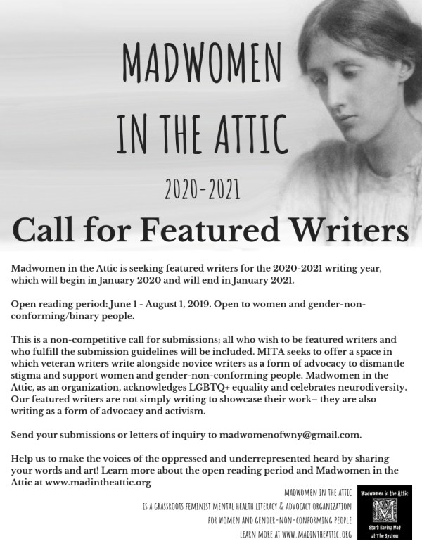 This is a non-competitive call for submissions, open to writers from any location across the globe; all who wish to be featured writers and who fulfill the submission guidelines will be included in this project and archive. MITA seeks to offer a space in which veteran writers write alongside novice writers as a form of literacy and advocacy to dismantle stigma and support gender-marginalized people affected by the mental health system, trauma, and stigma. The project features women and other gender-marginalized writers and artists who have been affected by the mental health system, psychiatric diagnostic or other mad-related stigmatizing labels, trauma, or forms of societal oppression that have been othering or alienating.